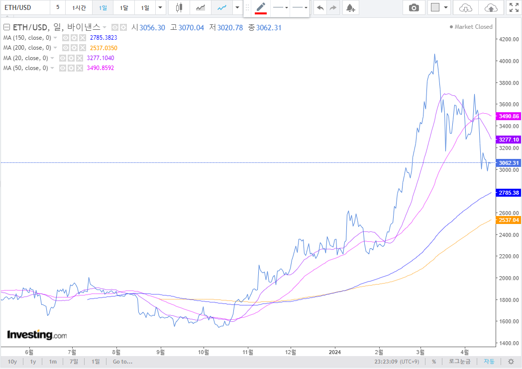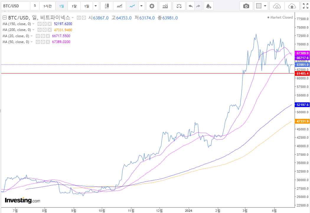 신고가 경신을 하였지만, 개인적으로는 돌파실패로 보며 조정 후 재상승할 것으로 기대. BTC & ETH 홀드전략을 선호. 소액으로 돌파매매하던 것을 돌파가 영 나오지 않아서 비중 정리하였음. 매크로 이슈로 현재 조정을 받고 있지만 BTC는 견조. $60,000 지지를 받고 반등하였음. 단기이평선이 꺾인 점이 아쉽다. ETH도 간신히 $30,000 지지받았다.