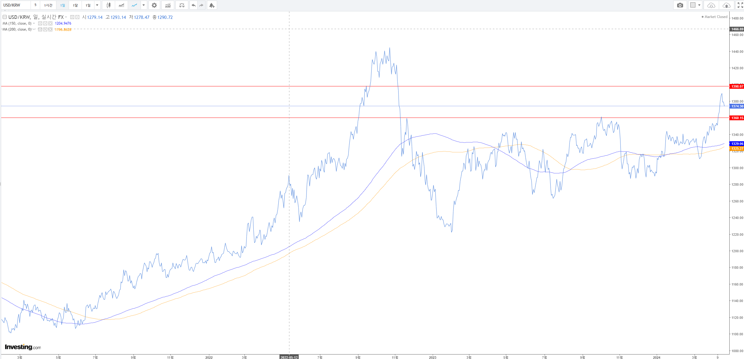 1. 원달러 환율 : 박스권 상단에 위치하였던 환율이 상방으로 돌파하였음. 원유가 상승, 인플레 등등 여러 이슈가 있지만 결과적으로 상방을 돌파하였음. 1,400원까지는 열어두었는데 정말 찍을지는 몰랐다. 참 변동성도 크고 어려운 장이다. 일단 하단 1,360원.
