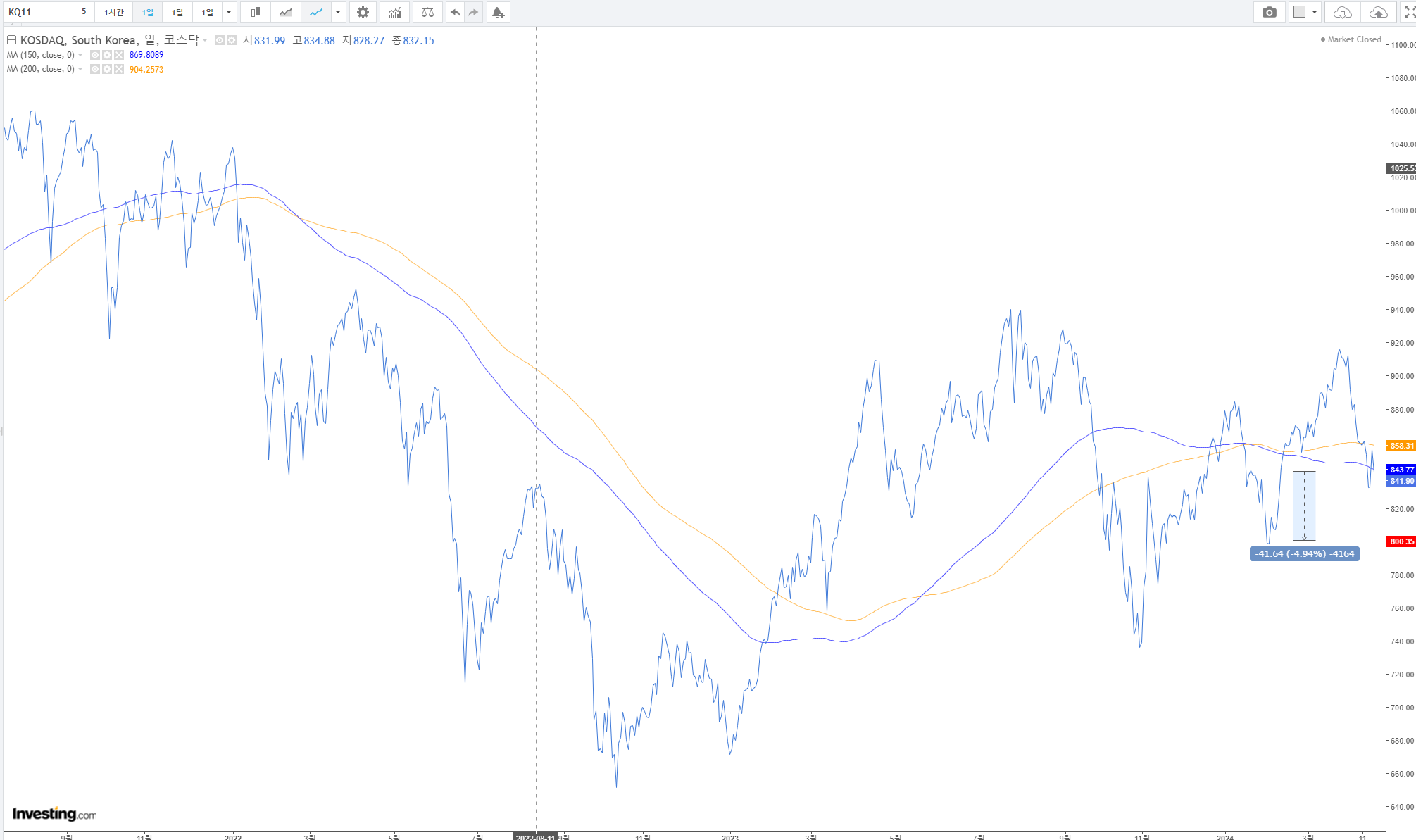 3. 코스피, 코스닥 : 코스피는 2,700pt -> 2,600pt 지지라인으로 봤는데 2,600pt 보다 약간 더 하락하였다. 2단계 돌파 후 매물벽이 어느 정도 있는 위치로 우연히 매크로와 맞물려서 베이스를 다지는 것처럼 보임. 매크로는 우호적이지 않은 상황이지만, 이평선 근처로 왔으며 2,500pt가 강한 저항선이라고 보고 약 -1.5%. 코스닥의 경우는 생각했던 대로 흘러왔음. 900pt 이상 매물이 많은 상황에서 돌파동력이 보이지 않았기 때문. 현재라인에서 지지를 받거나 800pt 지지를 받는 시나리오로 대응가능. -5% 정도 남았는데, 이평선에 걸려있어서 방향은 보면서 대응해야 할 듯.