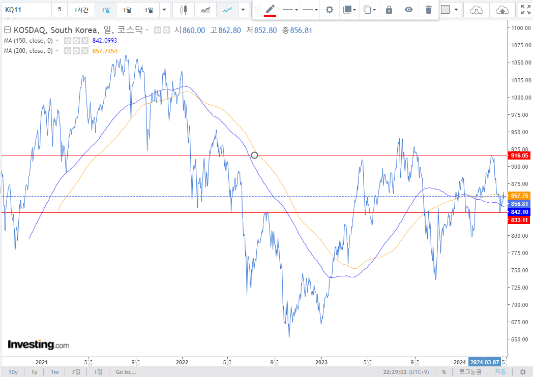 3. 코스피, 코스닥 : 과한 하락이 있었지만 이평선 근처에서 지지를 받으면서 반등에 성공한 모습을 보여주는 중. 이평선은 상승추세지만, 유의미한 것은 2,800pt 에 안착하는 것으로 보인다. 반도체가 시들했다가 다시 반등하는 모습을 보이는 만큼 기대를 해본다. 코스닥의 차트는 그다지 좋아 보이지는 않음.