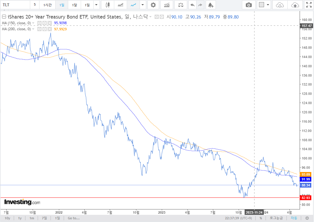 4. 채권(TLT, TLTW) : 90~100달러 부근에서 횡보하면서 1단계 완성이라고 보았으나, 매크로 이슈로 다시 횡보. 1단계. 내가 본 박스권 최하단이라고 생각하고 있으며 매수하기에는 괜찮은 시점이지만 하락 후 반등할 때 매수하는 것이 조금 더 일반적이며 아직 ISA계좌 이슈가 있어서 매수는 어려움. 일단 $85~90 정도 박스권을 생각하고 있음. 모아가기 좋은 시점이라고 보고 있지만, 반등을 보고 사는걸 조금 더 선호