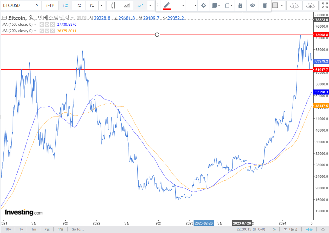 신고가 경신을 하였지만, 개인적으로는 돌파실패로 보며 조정 후 재상승할 것으로 기대. BTC & ETH 홀드전략을 선호. 매크로 이슈로 현재 조정을 받고 있지만 BTC는 견조. $60,000 지지를 받고 반등한 후 횡보 중. 반감기 사이클로 데이터를 보았을때 6월까지는 횡보할 가능성이 높다고 본다. 7월부터 상승이 나올 수 있다고 데이터는 말해주는 중.