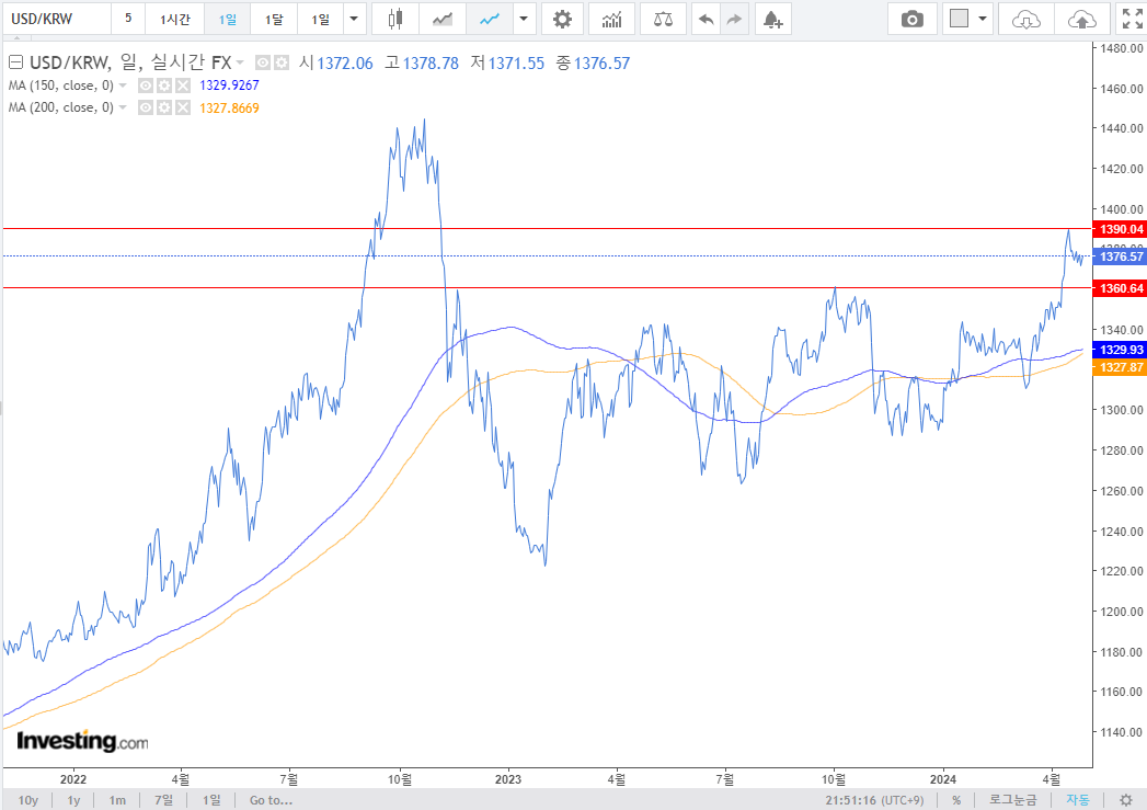 1. 원달러 환율 : 박스권 상단에 위치하였던 환율이 상방으로 돌파하였음. 원유가 상승, 인플레 등등 여러 이슈가 있지만 결과적으로 상방을 돌파하였음. 1,400원까지는 열어두었는데 정말 찍을지는 몰랐다. 참 변동성도 크고 어려운 장이다. 일단 하단 1,360원. 여전히 같은 뷰 유지.