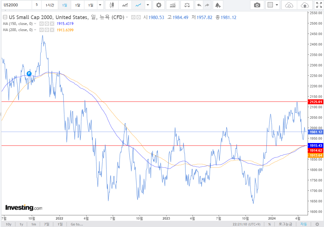 2. S&P 500, 나스닥 100 : 조정이 나올만한 자리에서 조정이 나왔으며 반등하였음. 한동안은 해당 박스권에서 횡보할 것으로 예상. 변동성 축소가 나오는 것이 가장 베스트라고 보며 아직 2단계. 러셀은 아직 2단계 진입을 실패한 1단계. 아직 상승추세로 보고 있으며 러셀까지 2단계 진입해야 찐 강세장이라고 볼 수 있다고 보는데, 매크로가 워낙 우호적이지는 않다.