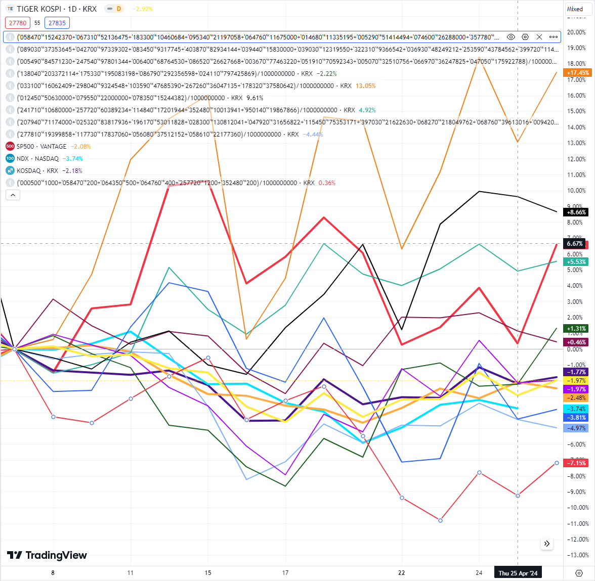 이차전지 인버스를 정리하면서 업종분산을 위해서 위의 4개 업종의 종목을 모두 편입하였으며, 전선주의 상승과 반도체의 상승으로 하락분을 모두 만회하였음. 반도체의 경우 같은 업종안에서도 다양한 이슈로 선별적으로 상승하는 모습을 보이고 있음.