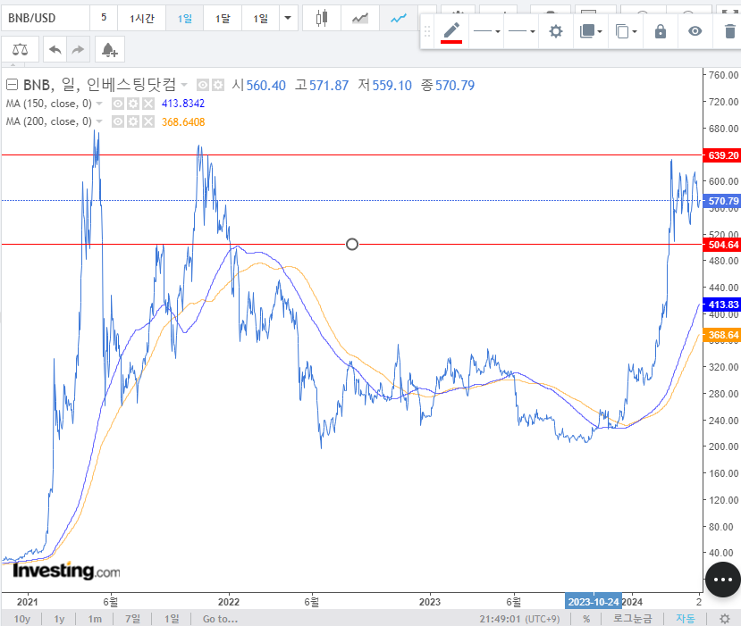 신고가 경신을 하였지만, 개인적으로는 돌파실패로 보며 조정 후 재상승할 것으로 기대. BTC & ETH 홀드전략을 선호. 매크로 이슈로 현재 조정을 받고 있지만 BTC는 결국 60,000$를 반납하고 지지를 받는 중임. 급등락이 심한 가상자산으로 150일 이평선까지 열어두고 풀백매매 시도가능 구간. 보수적으로는 50,000$. 덜 상승한 ETH의 경우 이평선자리까지 왔다. 3,000$ 지지를 받고 있는 상황에서 가상자산 또한 방향성을 확인하는 시간이다. 일부 BTC를 BNB로 전환하였고 메가드롭을 받을 계획. 차트적으로는 가장 견조하다. 차트만 보면 BNB 최우선 선호...