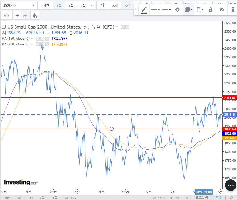 2. S&P 500, 나스닥 100 : 조정이 나올만한 자리에서 조정이 나왔으며 반등하였음. 베이스를 다지는 구간이라고 생각하며 시간이 지나면서 생기는 이평선의 상승을 주목해보려고 한다. 해당 박스권의 지지 + 이평선 지지를 받고 상승한다면 좋은 신호로 볼 수 있고, 하방돌파상태에서 반등하지 못한다면 굉장히 나쁜 신호로 볼 수 있을 것 같다. 작년 10월 같은 상황의 차트가 형성될 수도 있는 상황임. 한동안은 상승추세를 확인하는 시간이 될 것이라고 본다.