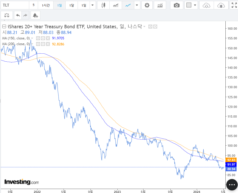 4. 채권(TLT, TLTW) : 90~100달러 부근에서 횡보하면서 1단계 완성이라고 보았으나, 매크로 이슈로 다시 횡보. 1단계. 내가 본 박스권 최하단이라고 생각하고 있으며 매수하기에는 괜찮은 시점이지만 하락 후 반등할 때 매수하는 것이 조금 더 일반적이며 아직 ISA계좌 이슈가 있어서 매수는 어려움. 일단 $85~90 정도 박스권을 생각하고 있음. 모아가기 좋은 시점이라고 보고 있지만, 반등을 보고 사는걸 조금 더 선호. 단기적으로는 바닥을 다지는 것으로 확인 중. $85는 쉽지 않은 가격으로 보임.