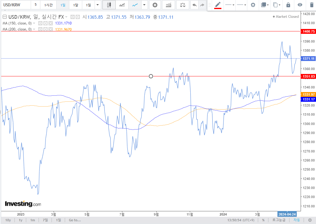 1. 원달러 환율 : 환율이 안정적으로 내려왔다. 좋다. 하지만 지지받을 수 있는 구간으로 보며, 하락의 방향성을 유지할까는 의문이 들었는데, 1,350원까지 급락했다가 다시 반등 중이다. 만약 다시 급등한다면 1,400원 부근에서는 당국 개입이 구두로 발표되었으므로 주식을 매수하기에 나쁘지 않은 시점이라고 본다.
