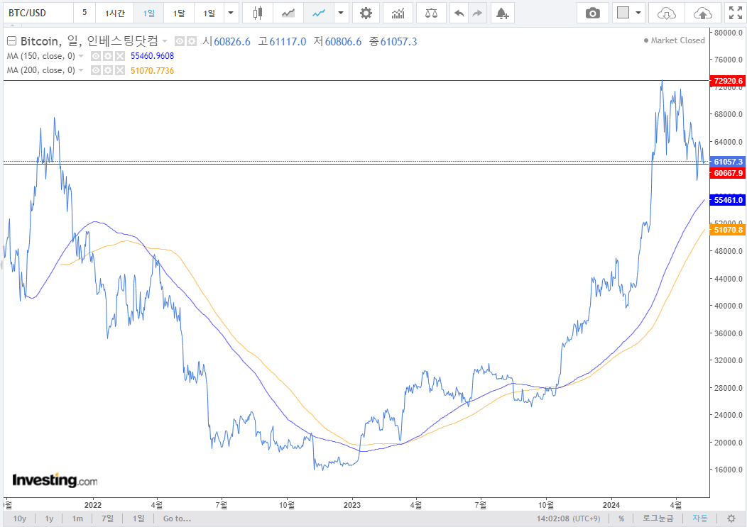 신고가 경신을 하였지만, 개인적으로는 돌파실패로 보며 조정 후 재상승할 것으로 기대. BTC & ETH 홀드전략을 선호. 박스권하단에서 약한 흐름. ETH를 기준으로 이평선과 만났고 BTC도 이평선과 가깝기 때문에 55,000$ 에서는 지지를 받을 것으로 기대한다. 하지만 내려꽃는다면 상당히 안 좋은 신호로 해석 가능하다. 개인적으로는 백테스트 기반으로 6월 중순~말부터 좋은 흐름을 기대하고 있다.