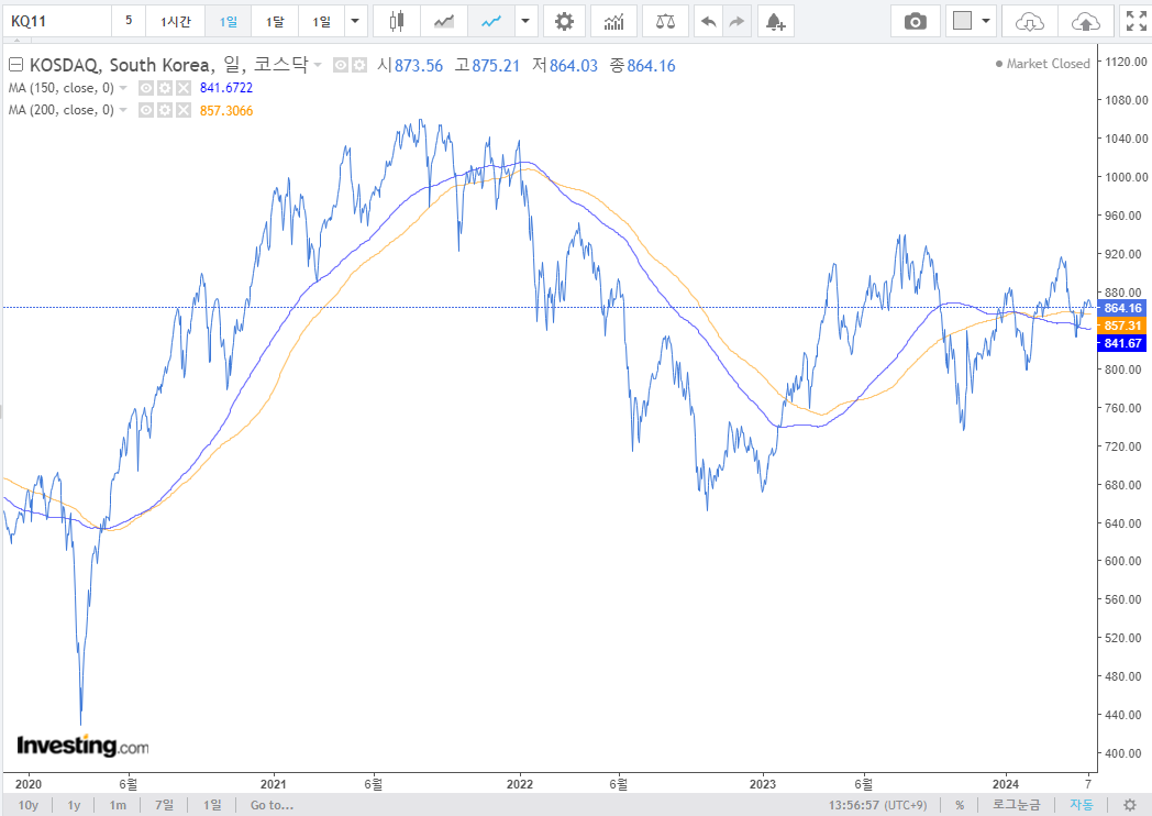 3. 코스피, 코스닥 : 코스피는 러셀과 비슷한 차트를 보여주며 2단계 진입을 지속적으로 시도하고 있다고 본다. 환율과 반도체가 도와줘야하는 부분이지만 상승한다면 2,900까지는 가볍게 상승할 수 있다. 결국 반도체가 도와줘야 한다. 코스닥은 여전히 박스권이며 상승장이라고 하여도 주도업종으로 구성되어있지 않기에 아직은 중립이다. 바이오 쪽으로 주도주의 흐름이 가야지만 더 큰 상승을 볼 수 있다고 본다.