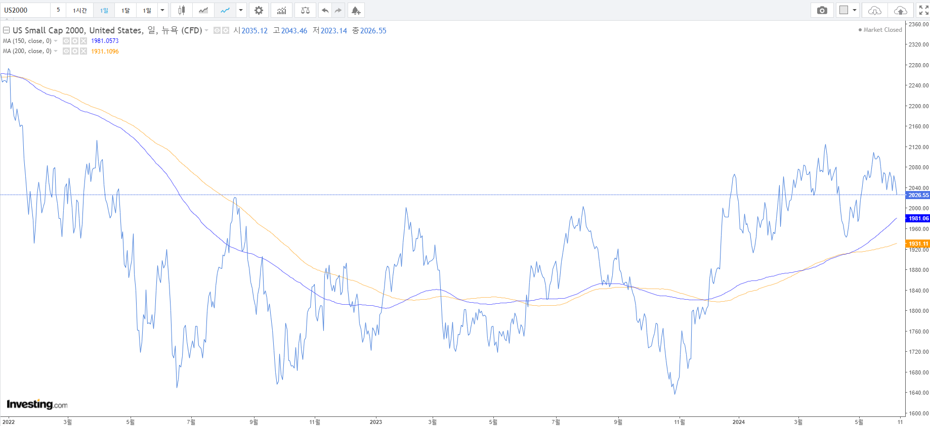 2. S&P 500, 나스닥 100 : 신고가 영역에서 약간의 조정을 받는 모습. 러셀 2000은 코스피와 같이 금쪽이처럼 2단계 돌파를 실패하고 있다. 시가총액 대형주의 캐리가 돋보이는 지수별 차트모습이다.