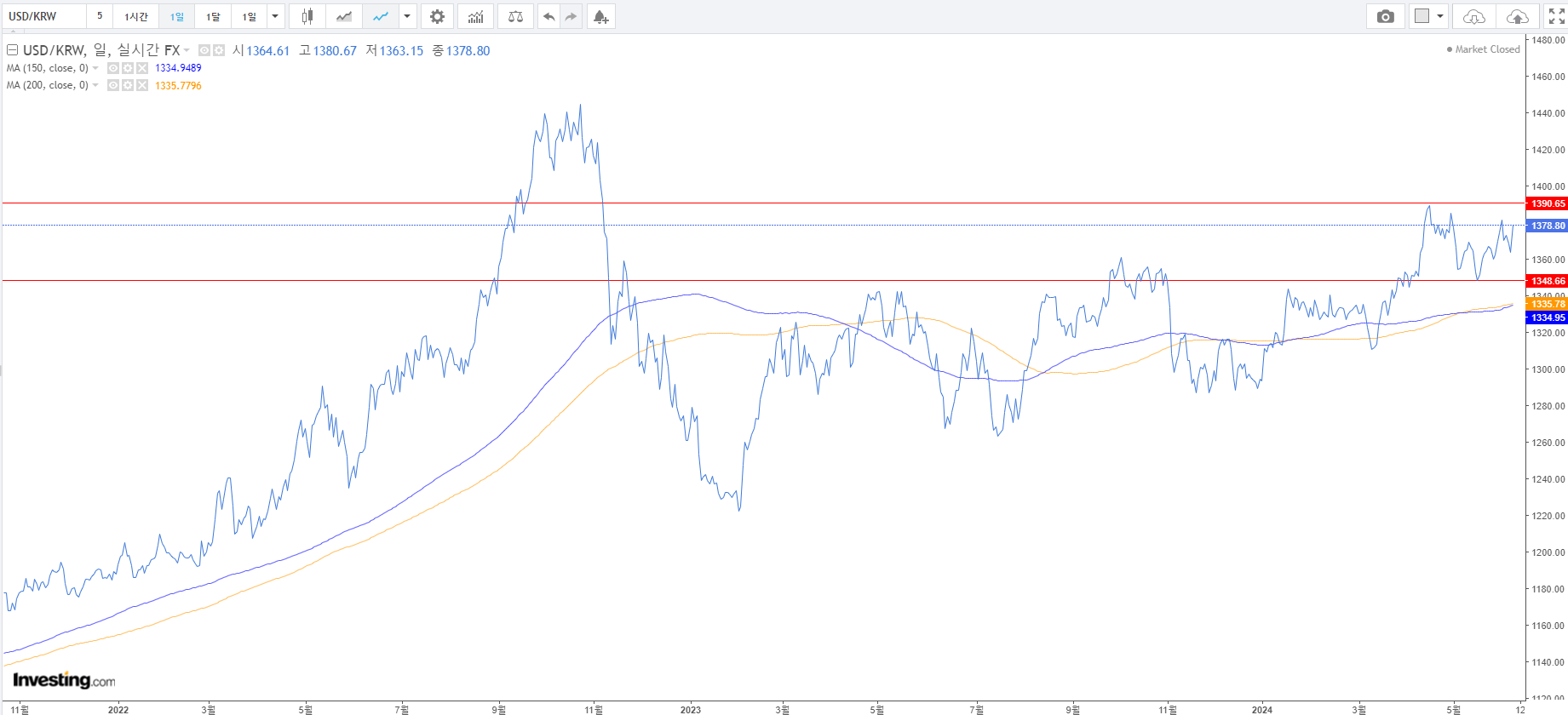 1. 원달러 환율 : 다시 환율이 상승하였다. 작은 박스권에서 횡보할 것으로 보았는데, 급하게 상승하면서 코스피가 하락하였다. 구두개입이 예상되는 1,400원 근방에서는 환율이 내려갈 가능성이 크다고 보고, 해당 시점에서 코스피는 단기적인 저점을 보일 가능성이 크다고 본다. 환율은 거의 그대로지만 코스피지수는 약간 상승