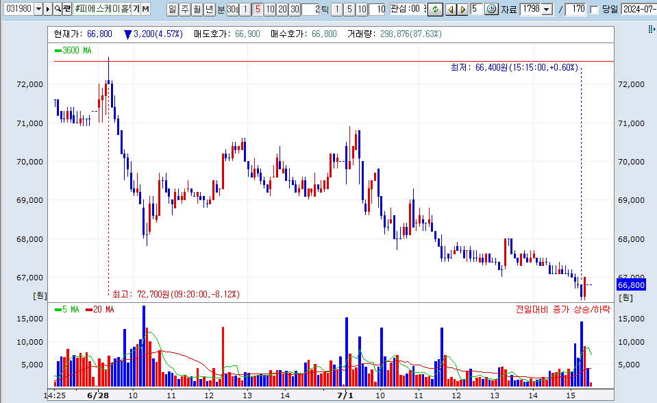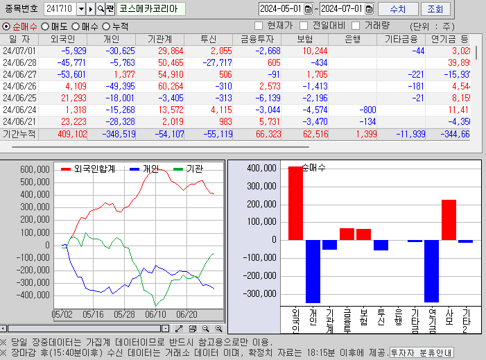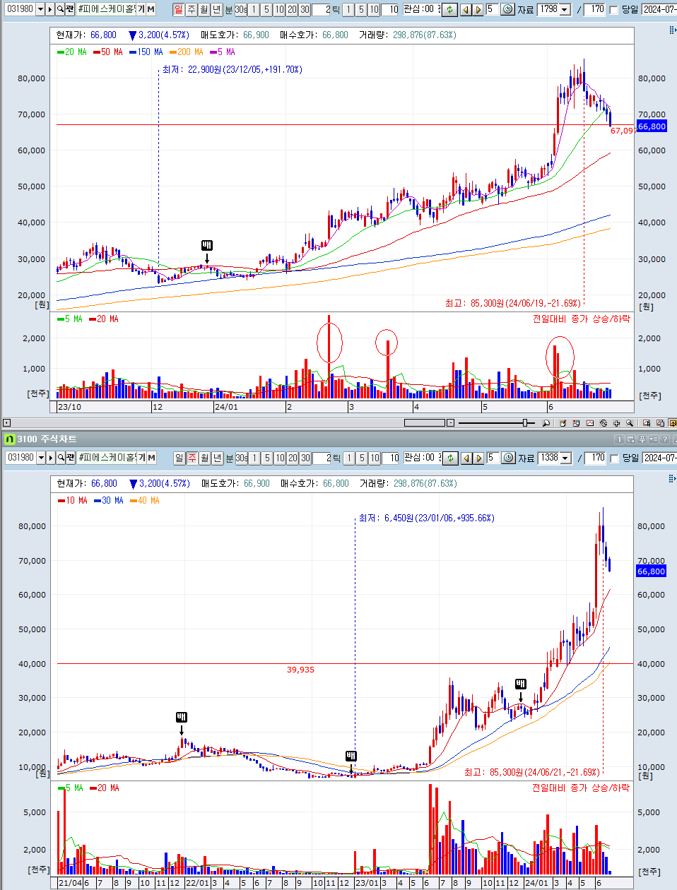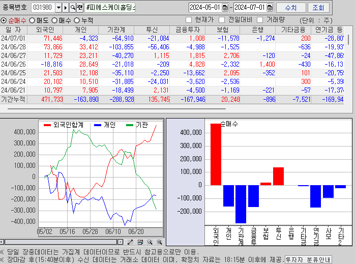 피에스케이홀딩스 : 효자에서 금쪽이로 변모중인 종목. 50일선까지 룸이 딱 손절선정도로 보인다. 비중이 들어간 편이어서 큰 수익을 잠시 맛보았지만, 어느 순간 피에스케이보다 강도가 떨어지며 흐름이 안 좋게 바뀐 친구. 기관의 매도세가 유효하다.