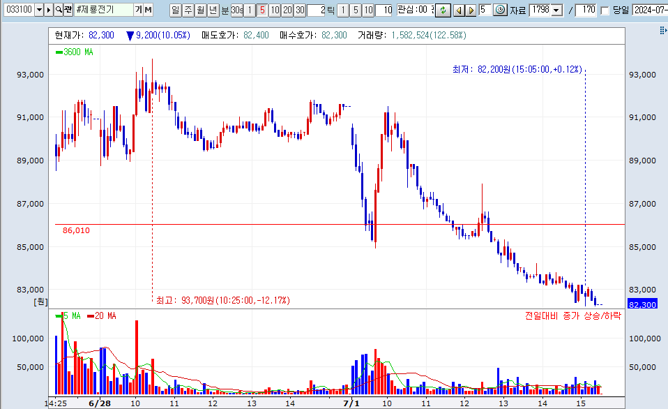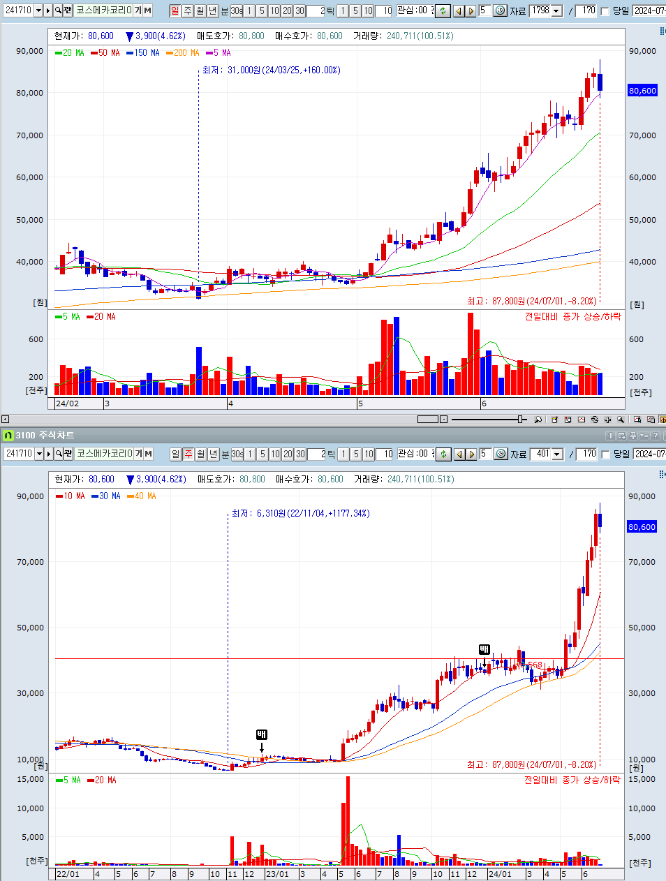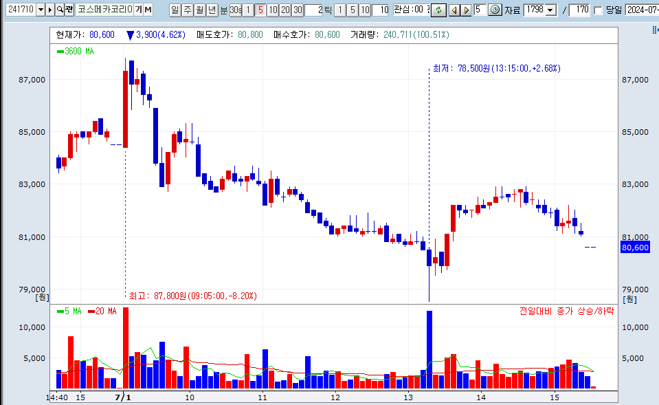 코스메카코리아 : 오늘 5일 이평선 가격보다 약간 높은 가격에 걸어놓았는데 체결이 되었다. 화장품 종목중에서 가장 차트가 좋은 종목이라서 매수를 걸어놓았다. -4%로 마무리하였지만 실리콘투, 씨앤씨인터내셔널처럼 하락폭이 심하지 않았다. 그 점도 좋은 점이라고 볼 수 있다. 5분 봉이 11시 이후 급격하게 무너지다가 8만 원선을 터치하고 살짝 되돌렸다. 다음에는 자석효과를 생각해서 8만 원에 매수를 걸어놔야겠다.