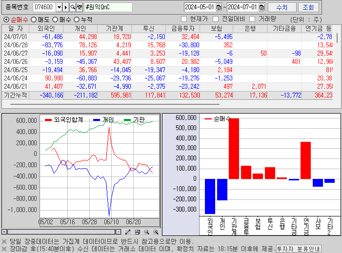 원익 QnC : 금일 흐름은 장 막바지에 빠지기는 했지만 방어력은 낫배드 같이 보인다. 거래량이 실린 돌파 이후에 베이스를 다지고 있어서 해당 베이스를 다지는 시간을 지켜볼 필요가 있다고 본다. 다행스럽게도 베이스라인이 살짝 무너지고 바로 되돌렸다. 손절라인은 전 고점이며 해당라인은 현재 형성되고 있는 베이스 하단이 깨지는 선이다. 기관이 주도.