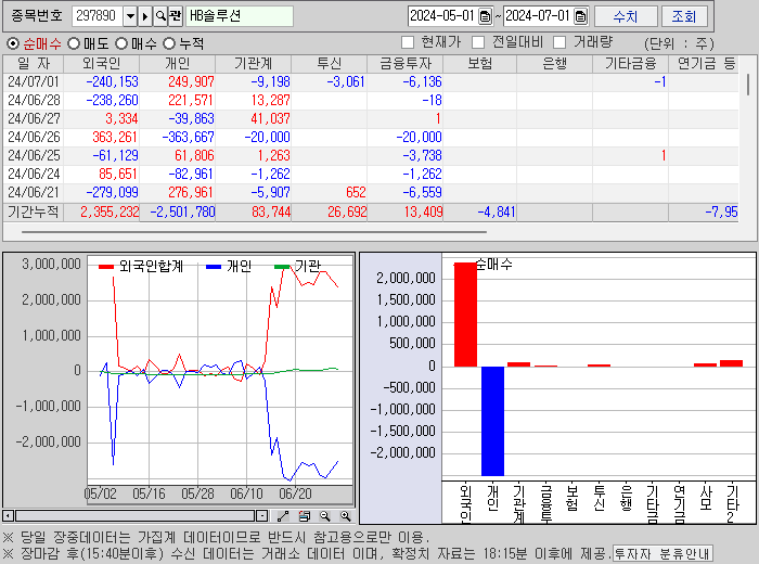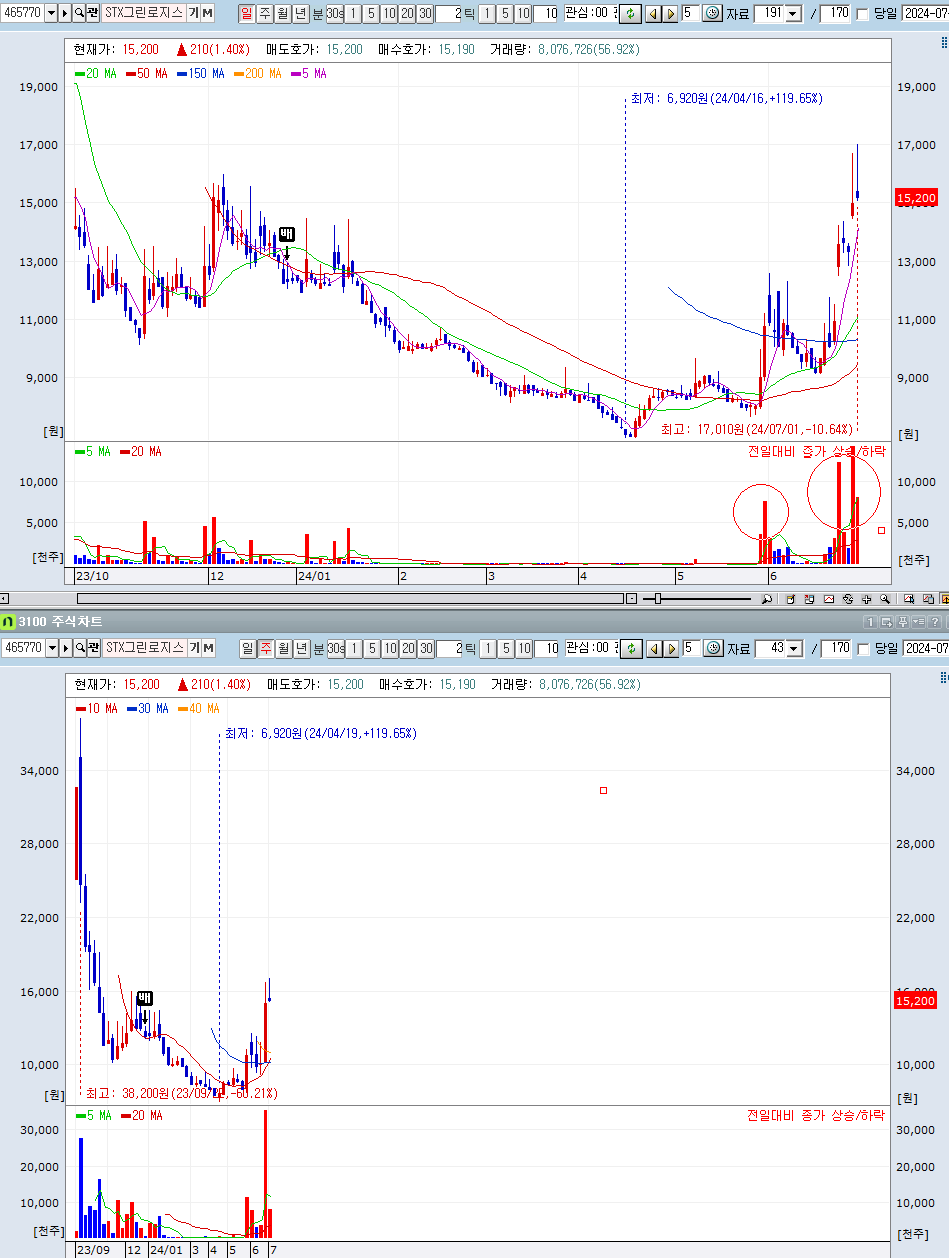 STX그린로지스 : 해당 종목은 이런 차트에서 조정이 나오더라도 결국 거래량이 강하게 나온 이후에는 돌파확률이 높았던 경험을 바탕으로 매수를 진행하였다. 15,000원 선에서 강한 지지가 며칠째 나오고 있는 모습이 좋고, 최근 해당 업종도 좋아서 매수하였다. 하루에 수익과 손실이 뒤집혔던 종목으로 풀백 매수도 끌리는 두 번째 종목이다. 시가총액이 너무 낮아 큰 비중을 담긴어려울 수 있고, 외국인이 매도포지션이고 개인 수급이 올리는 느낌이라 변동성도 심할 수 있기에 손절이 언제나와도 안 이상하기 때문에 풀백매도는 반려.