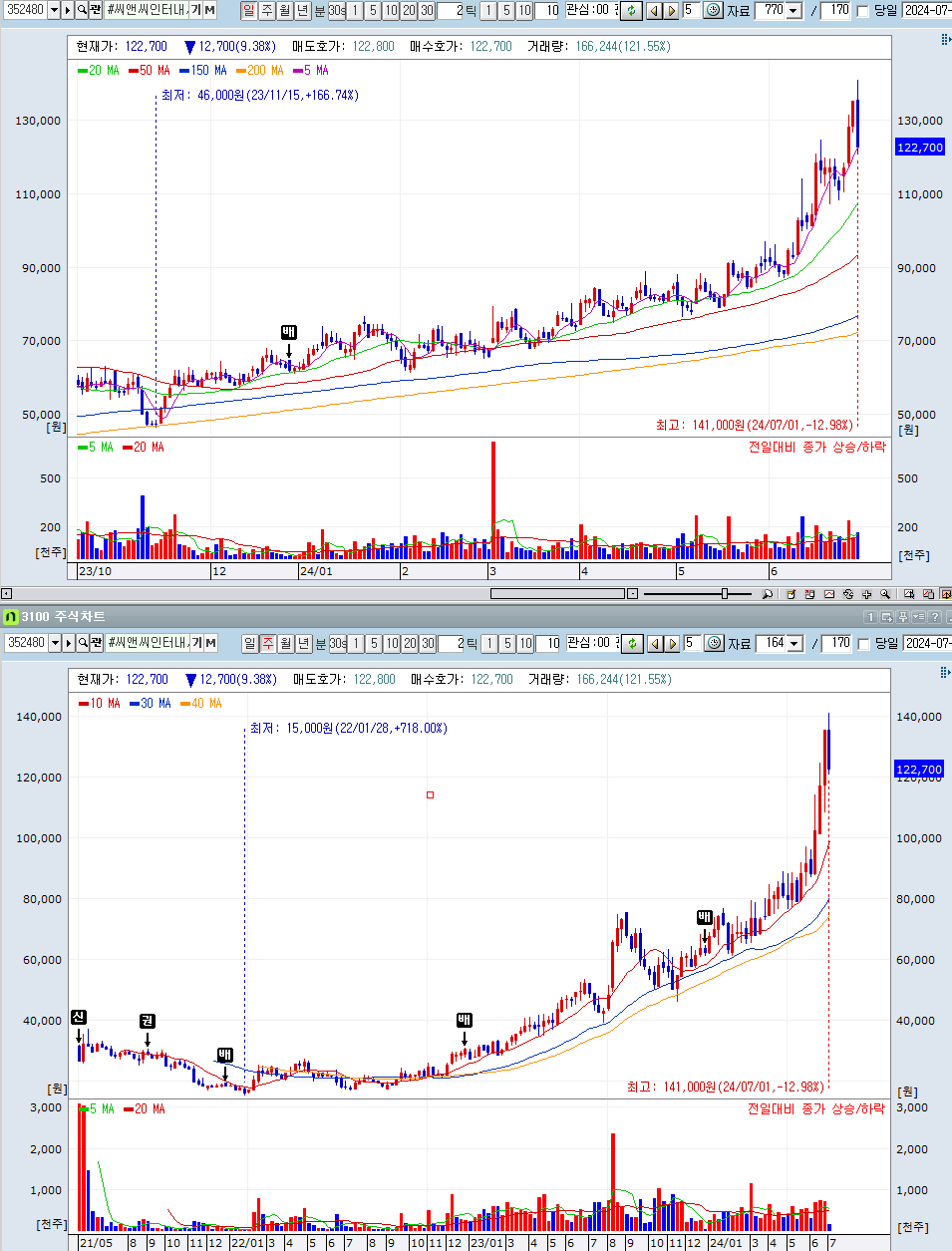 씨앤씨인터내셔널 : 코스메카코리아와 같은 논리로 매수를 걸어놨는데, 하락이 조금 더 빠르고 거쎘다. 먼저 체결되었으며 약간의 손실을 기록 중. 확실히 지수흐름과 반대로 하락을 지속하는 모습이 안 좋아 보인다. 거래량도 많다. 5일 이평선에 딱 닿아서 마감하였는데. 해당종목은 이전에 한번 7만 원 부근의 베이스에서 매수하였다가 지지부진해서 정리했는데 조금 매수가 빨랐다. 가장 좋은 매수 시점은 애매하다. 그때 당시에는 워낙 주도업종이 명확해서 해당 종목은 매력도가 낮았다. 무튼. 결론은 매도 거래량도 많았고 하루 흐름도 약했다. 더 지켜봐 줘야 하지만 아쉽다.