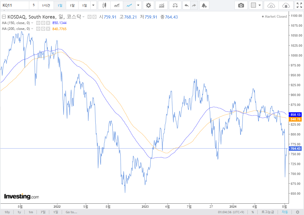 코스닥의 차트는 굉장히 좋지 않다. 2차 전지를 대신할 주도업종의 탄생이 필요하다. 그런 주도업종 후보가 바이오이다. 지수가 가려면 바이오에서도 시총 상위주가 가야겠다. 차트적으로는 이평선 밑으로 갔으며 저항선이 지지선으로 작용하기에 코스닥지수 투자는 X라고 보고 있었고, 실제 하락하였지만 생각보다 하락이 강력하다. 강한 지지선이라고 생각하는 700pt 근방까지는 아직 6% 정도 남아있다고 저번 주에 분석하였고, 기술적인 반등이 나온 상황이다. 여전히 차트는 좋지 않아 보인다.