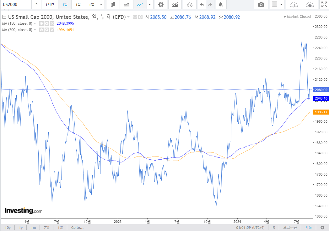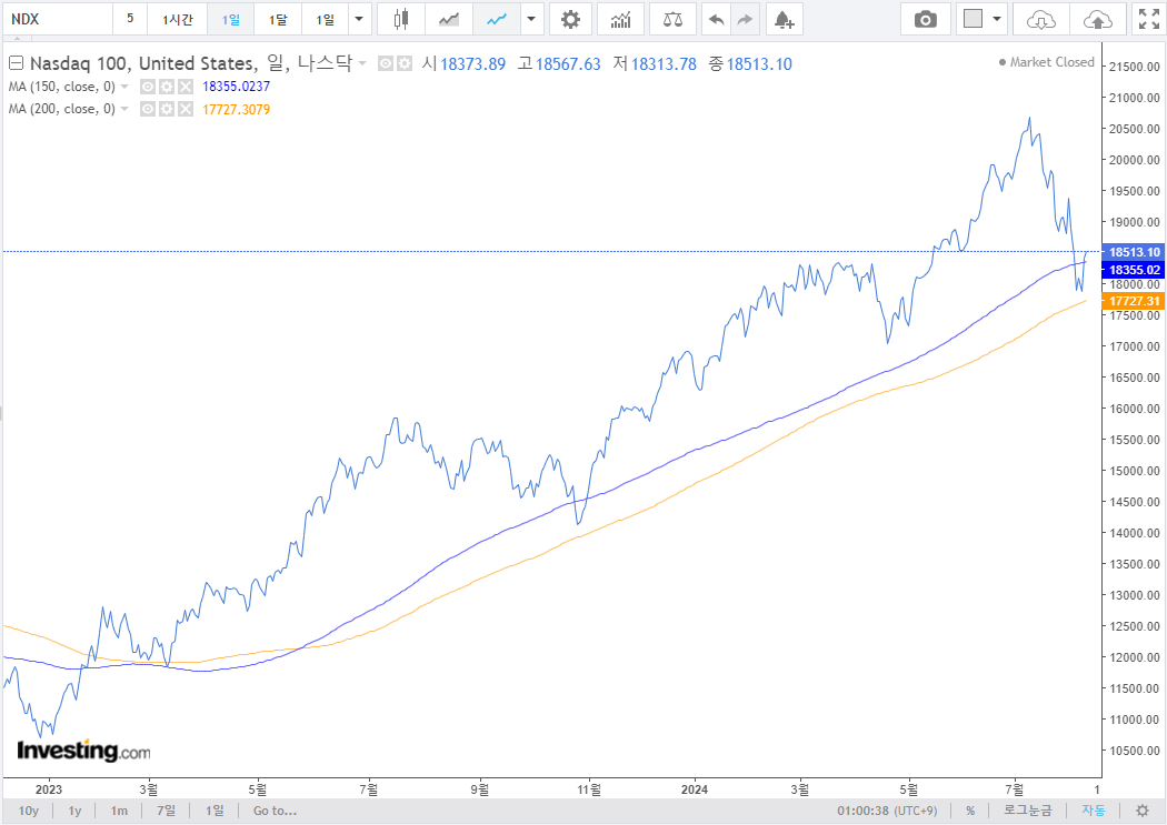 2. S&P 500, 나스닥 100 : 150일선을 터치하고 반등에 성공하였다. 다음 주에도 흐름을 살펴야겠다. 매물벽이 있는 상태에서 반등이어서 한동안 베이스를 다질 가능성도 있다고 본다.