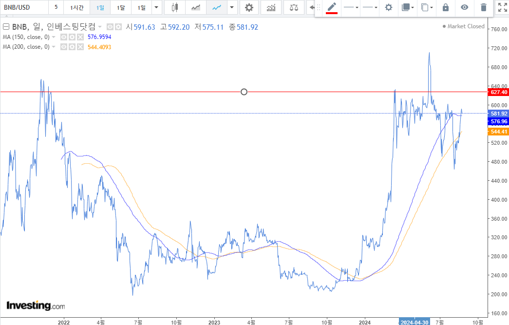 최근 흐름이 안 좋았다. 급반등을 하였으나, 이평선 근방에 와있다. 객관적으로는 몇 달간의 흐름이 건전한 조정을 넘어갔지만 가상자산의 변동성의 워낙 크므로 추후 흐름을 더 보는 중이다. BNB, BTC 가 기술적으론 가장 우수.