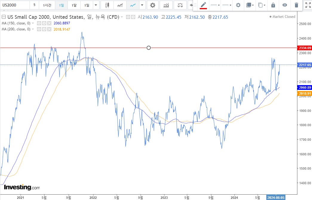 2. 나스닥 보다는 S&P 500이 차트상으로는 더 강하게 반등하였음. 러셀지수도 2단계 진입하였고 새로운 베이스를 형성하고 있다고 볼 수 있겠다.