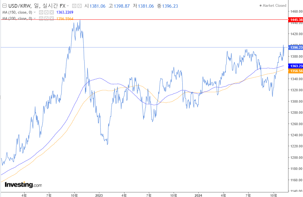 1. 원달러 환율 : 미국대선 전후로 상승추세가 지속되고 있다. 상단을 1,450원 정도까지 열어둘 필요가 있다고 본다. 미국금리가 변한다면 추세가 달라질수도 있지만, 한국입장에서는 금리를 내리기 어려운 이유도 하나 생긴 것 같다.