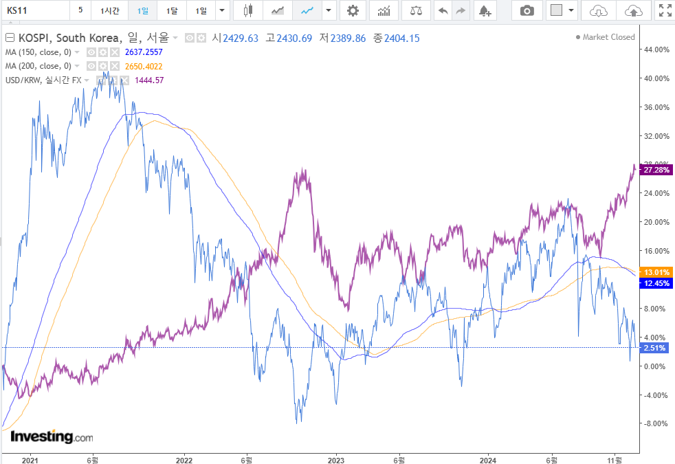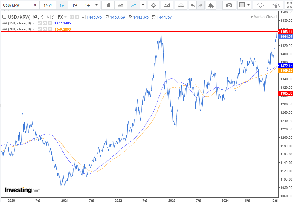 1. 원달러 환율 : 계속해서 불안한 환율이 유지되고 있다. 인플레 이슈로 금리인하가 어려울 것 같으며 중립금리도 높게 유지되는 만큼 주식과 채권이 동시에 하락하였다. 인플레 환경 속에서는 주식과 채권은 양의 상관관계가 된다. 며칠 동안 그런 모습이 관찰되었다. 미국의 금리인하가 어려워진다면, 한국 또한 그럴 것이고 환율이슈도 근시일 내에는 해결되기 어려울 것 같다는 판단이 시장의 컨센서스 같다.