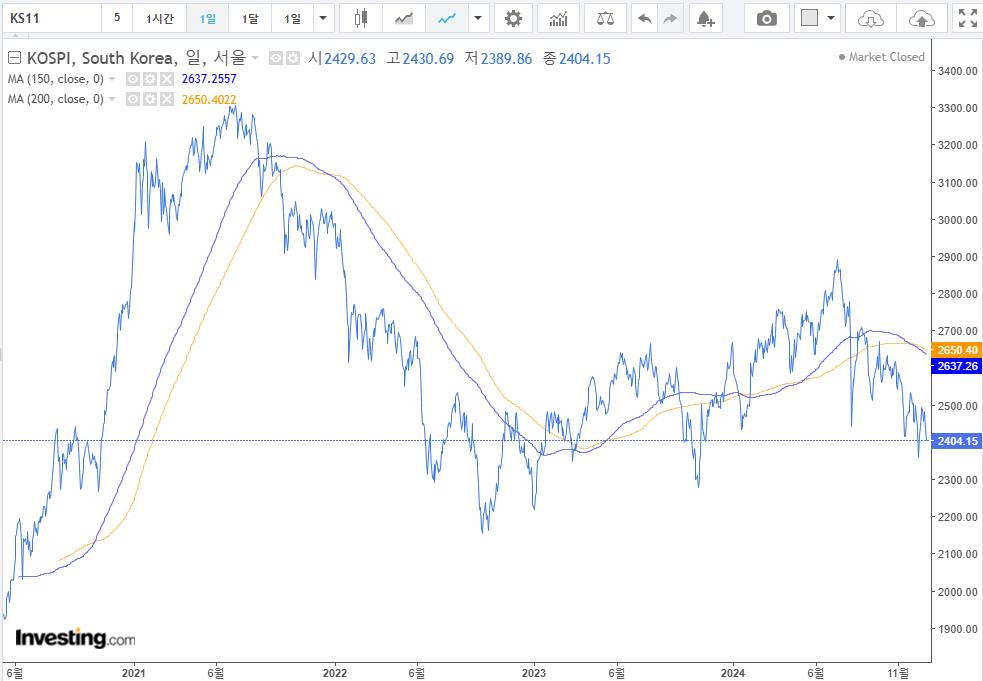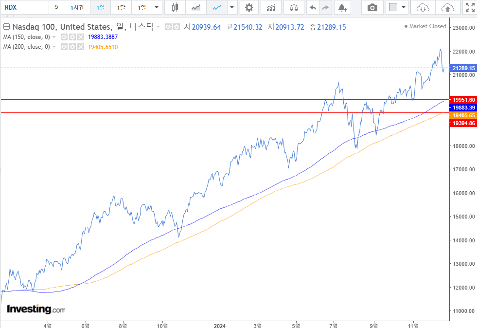 2. S&P500 은 최근 조정을 받았다. 생각보다 강한 이슈로 시장이 급락하였다. 여전히 2단계로 우상향하고 있기에 풀백에서 노려볼만하다고 본다. DC퇴직연금으로 돈이 들어오면 150일 이평선에서 매수하는 것이 목표이다. 해당 계좌는 중장기로 보고 매수할 계획이다. 나스닥은 스너피에 비해서 150일선을 지나치는 경향이 있어서 150일~200일 이평선 사이에서 ISA 계좌로 매수할 계획이다.