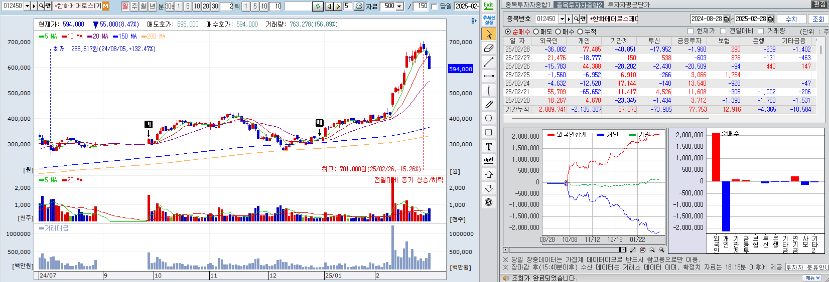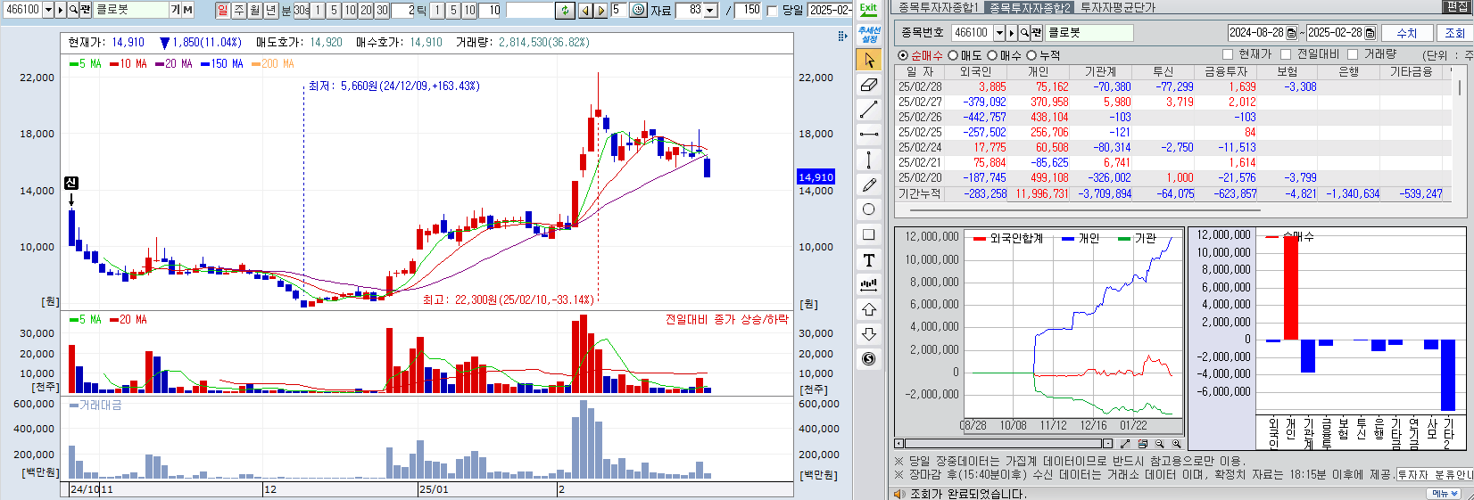 2. 주식시장의 조정과 아쉬운 판단 : 2월 중순이후로 주도업종이 다소 부재한 느낌을 받았다. 특히 이번 주에는 조선, 방산의 조정국면으로 보이는 부분이 있었다. 특히 조선주는 변동성이 확대되었고, 거래대금이 나왔는데 힘없이 빠지는 모습이 위험하다고 생각하였다. 수급은 개인수급으로 변하였다. 그래서 대부분 이익실현 및 포지션 정리를 통해서 안전하게 매매를 종료하였다. 방산도 돌파를 시도하는 것 같았지만 애매하고 10일 이평선을 하방돌파하는 모습이 전반적으로 관찰되었다. 하지만 포지션을 정리할 정도의 모습은 아니어서 포지션을 유지했다. 로봇은 더 지지부진했다. 한 주 내 내 주도업종 전반의 아쉬운 모습이 보였다. 어느 순간부터 바닥에 있던 주식(2차 전지, 반도체, xx인베스트등)과 공모주가 들썩이는 모습을 보면서 시장의 분위기가 이상하다는 판단을 하고 현금을 어느 정도 확보하였다. 코스닥 거래대금 상위에서는 일관성이 낮은 종목들만 눈에 띄었다. 지수상승을 주도해 왔던 주도업종들이 쉬어가면서 비주도업종에 온기가 퍼져나가는 현상이 그렇게 좋게 보이지는 않았다. 상승하는 종목은 돌아가면서 이것저것 있었지만, 업종 전반으로 상승하는 주도업종이 잘 보이지 않았던 점이 부정적으로 보는 이유였다. 화장품, 엔터 같은 애매한 업종들도 있었다. 오늘은 결과적으로 20일선까지 하방돌파하는 업종도 보인다.