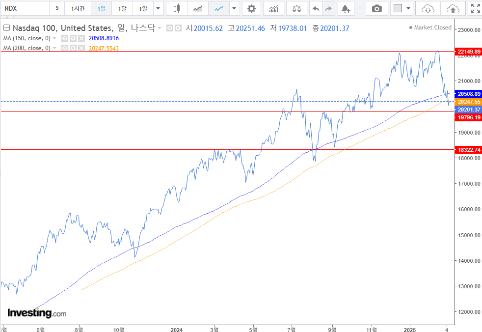 2. 미국 : 변동성이 확대되는 모습. 하락추세로 전환. 200일선 지지를 받을 것으로 생각되지만 하방돌파하는 경우 반등을 확인하고 매수하는 것이 바람직할 듯. 난도는 높음. 이평선 왔다 매수가 난이도는 낮지만, 현재 상황에서는 물릴 가능성도 상존. 강한 지지를 보여왔으므로 중요한 지점. 하락시작이다!! 관점보다는 보통 고점에서 강하게는 -30%는 나오니 -20%까지는 열어두어야 한다는 생각.
