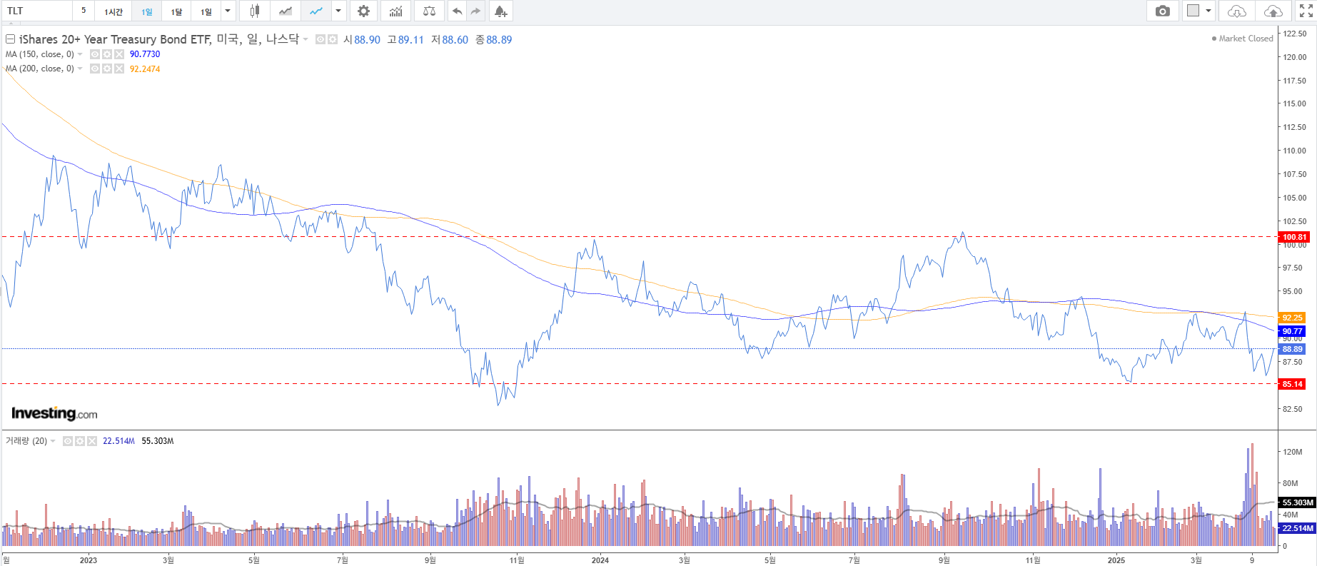 4. TLT, TLTW : 100달러가 강한 저항이라고 생각하고 있었는데, 이평선도 못 뚫고 급격하게 내려왔다. 그래도 하방이 단단하게 확인되는 모습이다. 해당 지점에서 매력적인 가격이라고 생각한다.