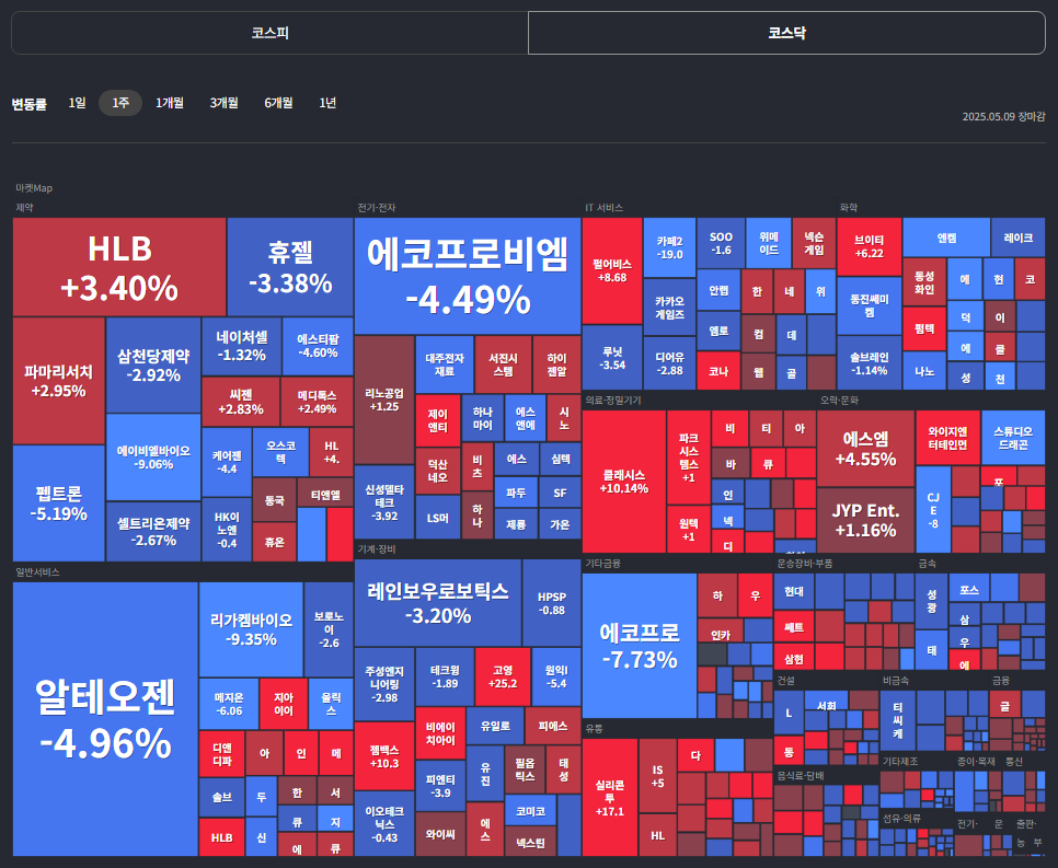 한국장은 아주 화끈한 상승이 몇 종목에서 나왔다. 방산과 화장품에서 신고가를 돌파하는 모습이 차례대로 나왔다. LIG넥스원, 에이피알 등등 돌파매매로 수량을 확보하였다. 조선업종도 강하였다. 전주와 동일하게 코스닥에서는 매일 정치테마주에 대금이 쏠린다. 번외로 3단계 진입하고 있다고 생각했던 전력기기도 다시 2단계 궤도로 정상화하는 모습이 살짝 나오고 있다. 효성중공업의 전고점 돌파를 주시해야 한다. 엔터도 2단계에서 좋은 흐름이다. 게임도 뭔가 드릉드릉하는 모습이다. 바이오는 관세이슈 and 거래대금 부족으로 말라가는 시점이라고 판단하여 대부분을 수익실현하거나 비중 정리를 하였다. 알테오젠만 절반정도 남아있다. 대선 끝나고 추이 지켜보기.