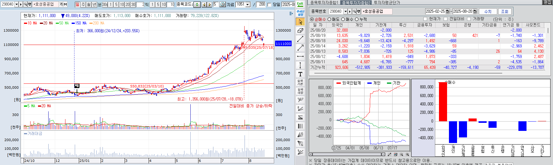 4. 전력기기 : 효성중공업, 산일전기만 신고가영역으로 들어갔다. LS, HD현대일렉 등은 신고가 달성에 실패. 효성중공업 현재 보유 중이며 추가 포지션 확보 시에는 산일전기 포트에 확보가능하다. 현재 위치 좋아 보인다. 몇 종목만 신고가를 돌파하였지만, 해당 종목들의 수급이 좋다. 화장품보다는 업종 전반의 흐름이 우세하다고 판단한다. 최근 철강이슈가 노이즈라 판단하고 풀백매매도 가능한 부분이다. [효성중공업 보유 중, 산일전기 매수]