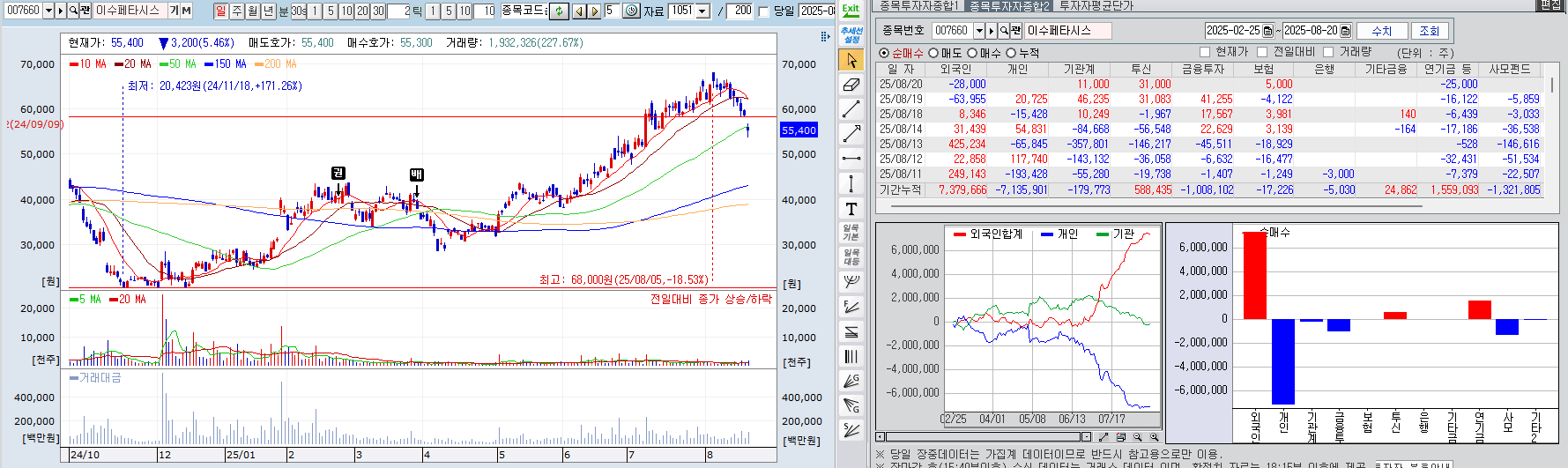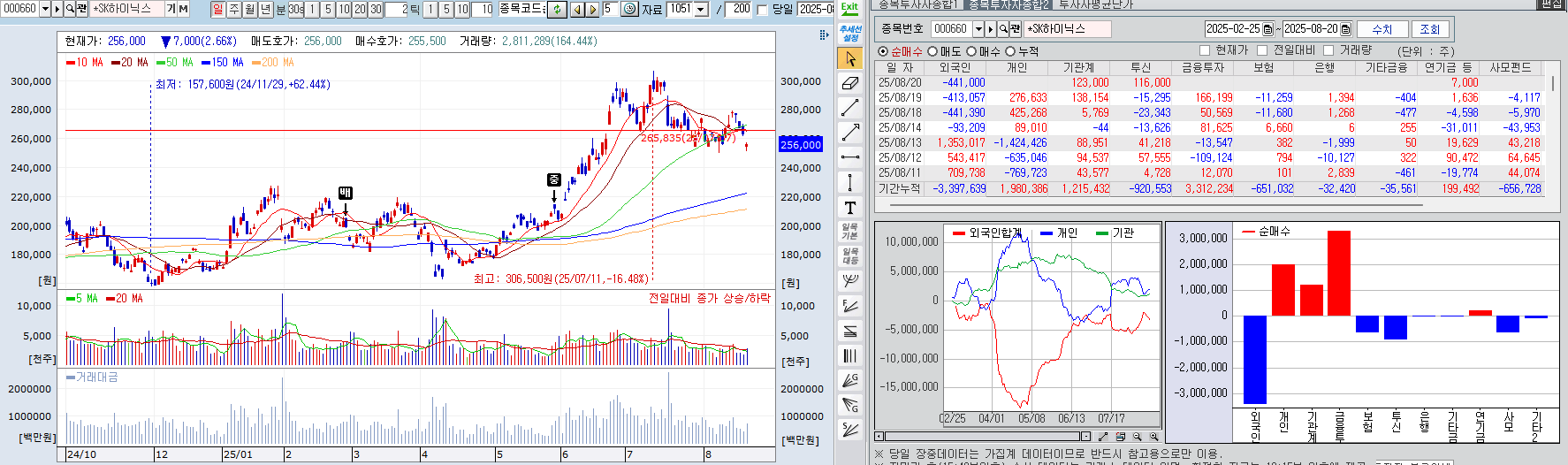 7. 기타(반도체, 엔터) : 삼성전자와 하이닉스를 엔비디아 강세 때문에 보유 중이었는데, 영 꼬였다. 삼성전자를 크게 확보한 것은 그 상황에서는 잘한 것 같다. 삼성전자는 차트가 유의미한 차트이며 다른 반도체종목 급락에도 크게 밀리지 않는 것이 좋아 보여서 포지션을 유지할 것이다. 편입할 당시에도 주도주가 힘을 잃으며 포트폴리오 다각화 및 보수적인 세팅을 위해 반도체를 편입했기에 삼성전자 포지션은 유지한다. 반대로 하이닉스는 엔비디아와 상승은 디커플링 되고 하락만 커플링 되는 아주 안 좋은 상황이어서 포지션을 지속적으로 줄여왔고 오늘 아예 정리할 계획이다. 이수페타시스의 경우에는 돌파 후 수익권이었지만 최근 연이은 하락으로 하락전환을 하였다. 손절가를 터치하면 정리할 수 있으며 돌파지점을 터치하였다. 수급이 좋으므로 지켜볼 계획이다. [삼성전자. 이수페타시스 비중축소, 하이닉스 매도]