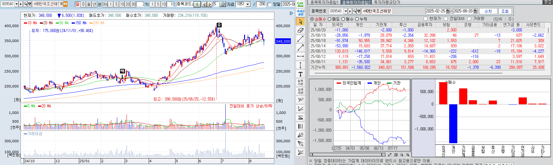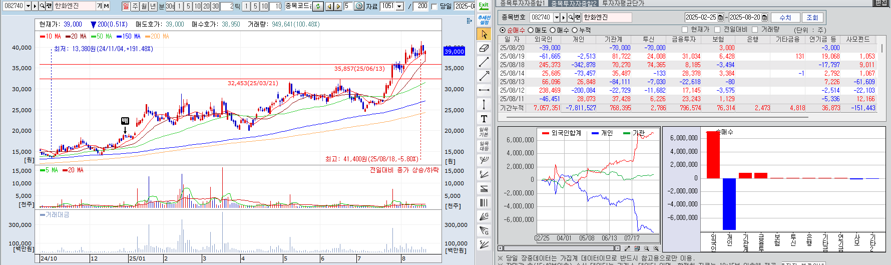 6. 조선 : 상위 3 종목은 여전히 신고가 영역으로 굉장히 강한 모습을 보여주고 있다. 주가 상승과는 별개로 나는 털리고 매수하고를 반복하여 크게 수익을 못 본 업종이다. 작년 말부터 계속 스토리가 양호하고 실적까지 좋았다. 최근까지도 지속하여 뉴스가 나오며 내러티브가 좋다. 그렇다 보니 승률이 안 좋아도 계속 포지션을 확보하고 털리는 것을 반복하고 있다. 한화오션을 보유 중이며 이번 주 급락으로 손실상태이다. 상위종목을 제외하고도 베이스를 다지는 중이지 하락추세로 전환처럼 보이지는 않는다. 포지션 필요하다 한화엔진은 금일 20일 이평선 터치 후 미리 반등을 하였다.. [한화엔진, HD현대마린 엔진 매수]
