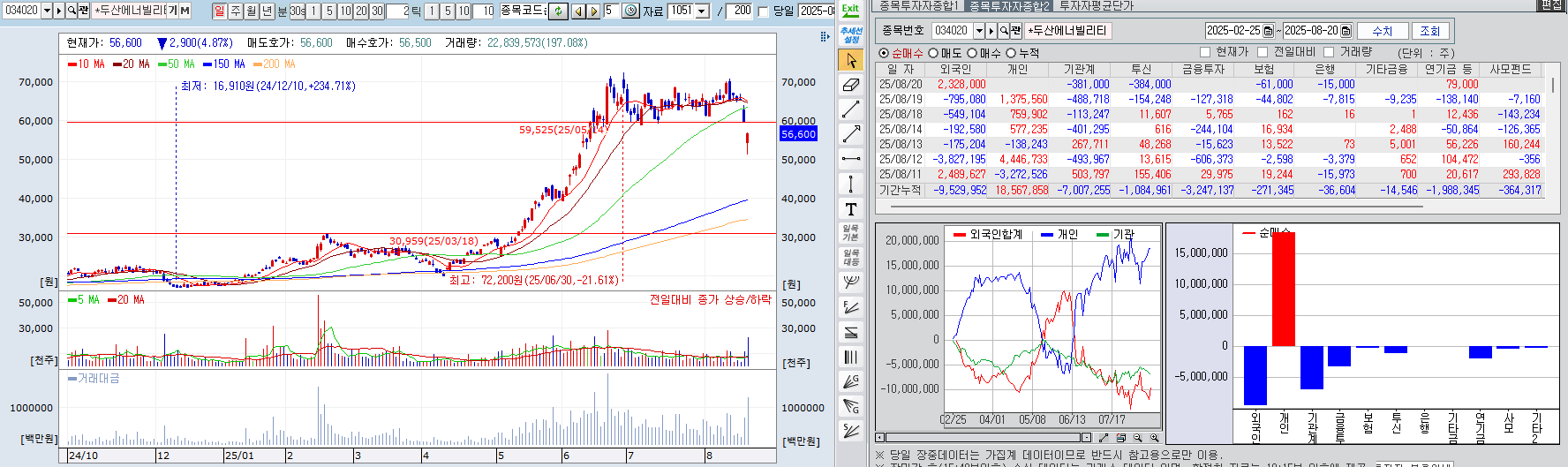 3. 원전 : 업종 내에서도 주도주를 해야 하는 이유를 다시 한번 볼 수 있다. 처음 상승은 두산에너빌리티와 비에이치아이가 주도하였다. 급등 이후 부스러기가 현대건설, DL이앤씨로 떨어졌다. 모멘텀이 약해지고 조정이 오자 부스레기 주식들은 더 크게 하락하였다. 오늘 기준으로 악재가 나오면서 의미 있는 구간을 하방돌파하였다. 수익을 낭랑하게 챙긴 업종이어서 소규모 포지션으로 몇 번 추가매매를 하였는데, 모두 돌파실패하며 손절이 나왔다. 수급이 많이 안 좋아서 거래하지 않으려 하였으나, 워낙 거래대금이 엄청나서 몇 번 시도하였다. 두산에너빌리티는 개인수급이 워낙 강력해서 기피된다. 반면에 비에이치아이는 수급은 나쁘지 않아 보인다. [포지션 X]