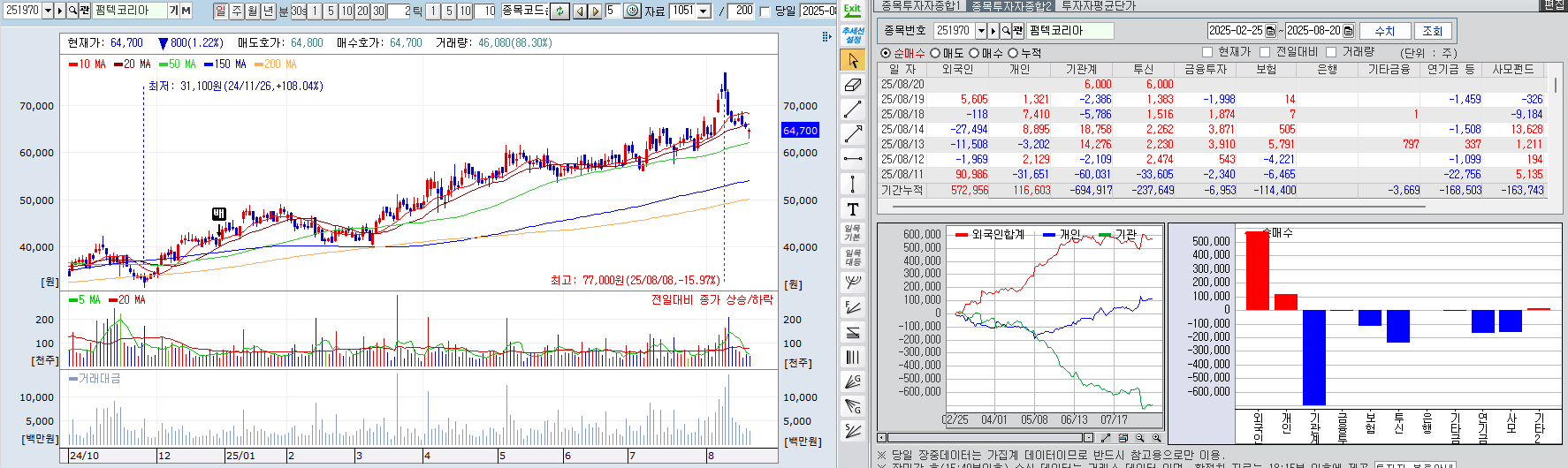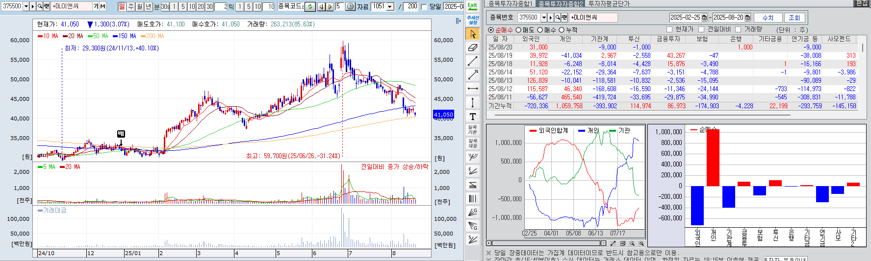 거래대금이 없는 와중에 신고가를 돌파한 와이지엔터를 매수하였고 흐름이 좋았다. 업종 전반의 강세가 아직 나오지 않았지만 포트폴리오 분산차원에서 매수하였으며 최근 하락에도 강한 모습을 보여주고 있다. 관세로부터 자유롭고 최근 좋은 소식이 많아서 좋다. 현재 비중이 딱 적당해 보여서 유지할 것이다. 큰 자금이 들어오지 않는다면 현재 주도업종들은 돌파가 어렵겠지만 엔터주들은 가능할지도 모른다? [와이지엔터 보유]