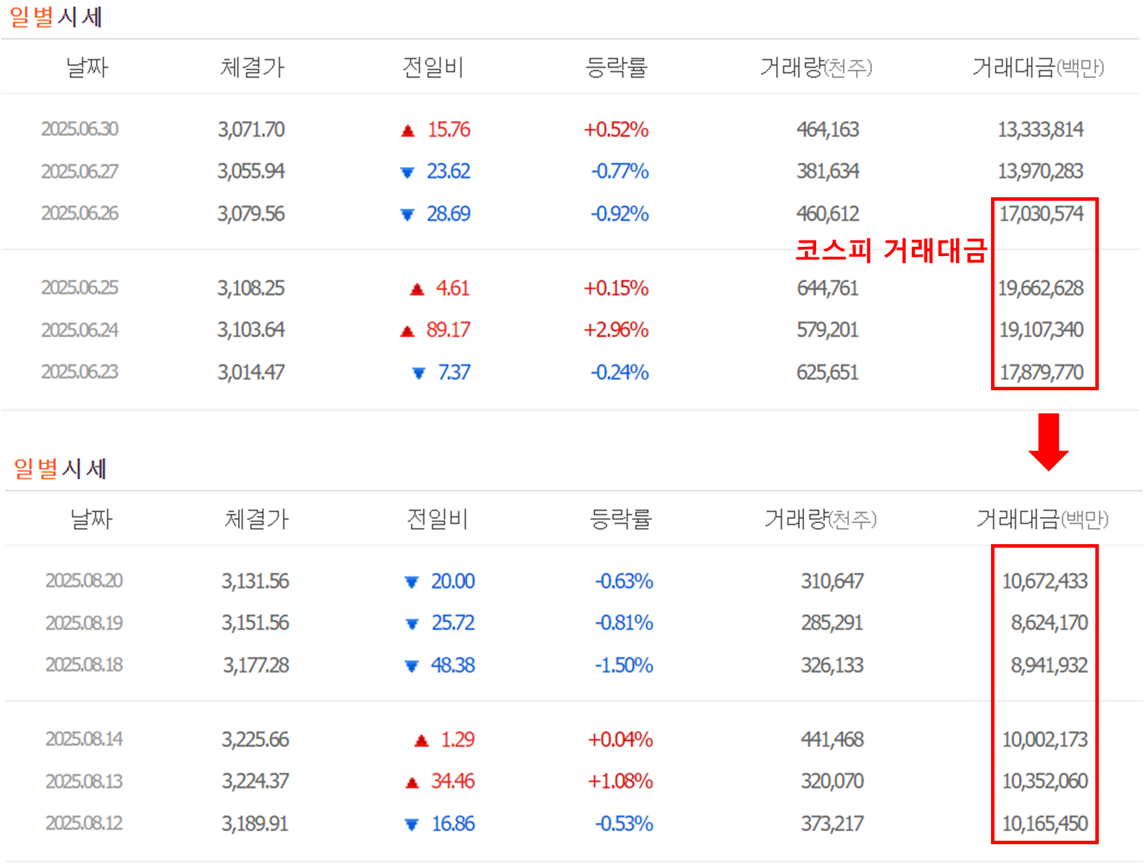 코스피의 거래대금을 보면 한창 장이 좋았던 6월 말, 19조까지 올라갔던 대금이 현재 10조 수준까지 내려왔다. 거래되는 돈이 절반으로 줄어들었다. 코스닥은 거래대금이 크게 오르지도 않았는데, 그 수준에서 더 내려왔다. 상반기 상승은 자금이 큰 외국인, 기관이 주도하였으며 개인은 코스닥에 베팅하지 않았다. 그래서 바이오 종목에 눈길을 거의 주지 않고 가장 차트가 좋은 몇 종목만 분산의 개념으로 투자하였다.