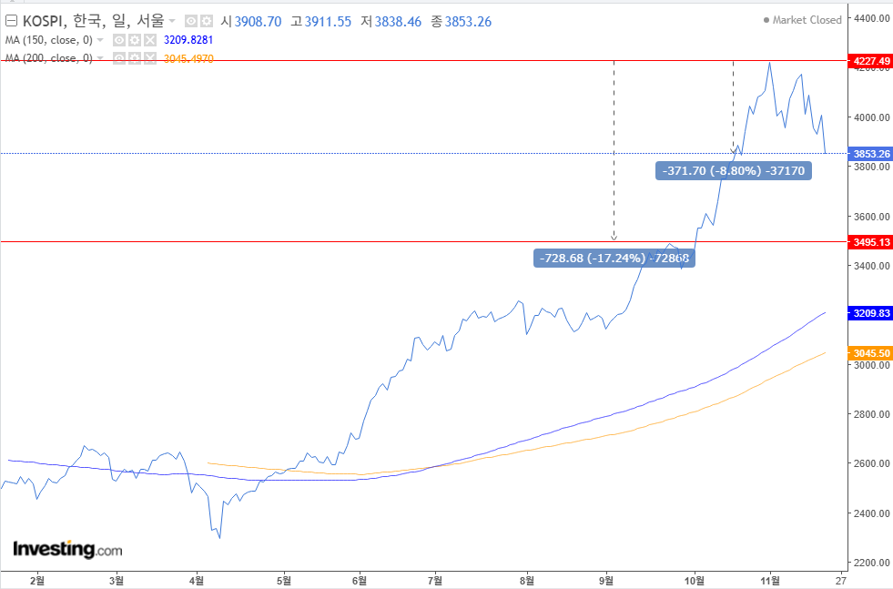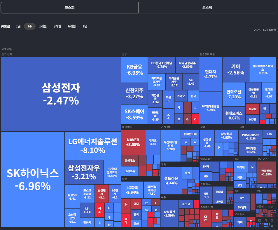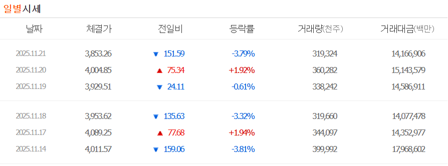 3. 한국 : 리가켐정도만 보유한 상태. 미국장과 크게 다른 흐름이 아니다. 돌파 성공인척하는 경우가 많다. 그래도 척이라도 하는 것은 장이 상승세로 가면 진짜 성공할 수 있으니 잘 봐야 한다. 반도체/전력/바이오. 코스피 거래대금이 큰 하락이 나온 11월 초의 절반 수준까지 내려갔다. 돌파가 나오기 어려운, 확률이 굉장히 낮은 장의 환경이다. 쉬어야 한다.