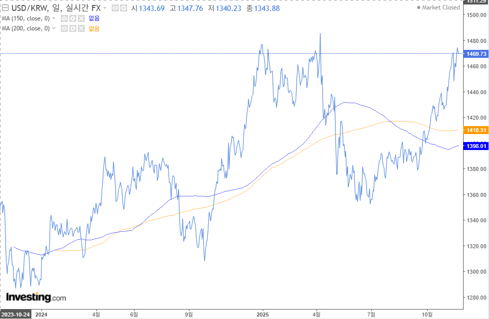 1. 원달러 환율 : 환율이 계속 높은 상태, 200일 평균값이 1,400원이다. 일단 전고점 부근에서 약간 하락하긴 하였지만, 올라가는 상승세가 굉장히 가파르다. 반도체 주식의 흐름이 좋았을 때도 환율은 지속적으로 상승하는 모습이 나왔는데 4~9월 정도의 흐름이 좋은 흐름이라고 판단하고, 환율이 다시 추세를 잡거나 안정화될 때 국장은 포지션을 잡는 게 좋아 보인다.