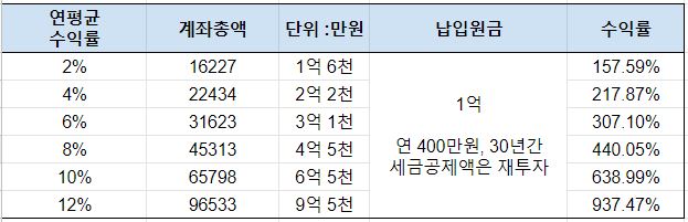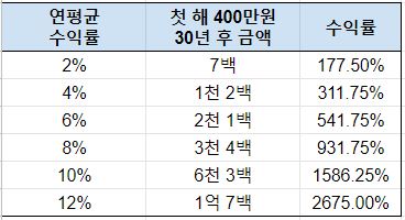 짜짠~! 연복리수익에 따라서 첫해에 납입한 400만 원의 가치는 말도 안 되게 차이 나게 되죠? 이것이 복리의 마법입니다. 400만원을 연복리수익 12%로 30년 굴린 금액이400만원을 30년납입한 금액과 거의 비슷하니까요.