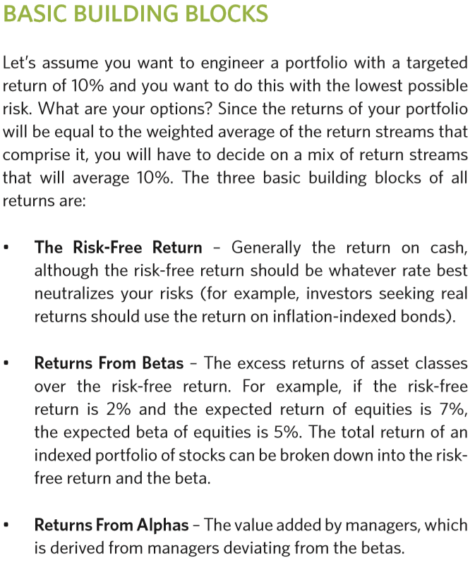 반면에 알파는 다르다. 알파의 원천은 많고 서로 상대적으로 상관없다. 그러나 알파의 수익은 위험 조정 수익은 장기간에 걸쳐서 평균적으로 다소 마이너스를 기록하기에 신뢰도가 떨어진다. 알파 예상 수익률은 다음과 같은 총 두 가지 이유로 다소 부정적이다. 첫째, 알파를 추구하는 것은 제로섬 게임이다. 한 관리자가 알파를 얻기 위해서는 다른 관리자가 손해를 보아야 한다. 둘째, 거래 비용과 수수료가 있다. 이 약간의 마이너스 평균에 대한 위험 조정 수익의 범위는 엄청나다. 왜냐하면, 이 제로섬 게임에서, 특출난 관리자들은 뛰어난 알파들을 생산할 수 있고 불쌍한 관리자들은 매우 부정적인 수익을 달성하기 때문이다. 따라서 관리자를 선택하고 알파의 균형을 잡는 것으로부터의 보상이나 벌칙은 매우 크다. 그리고 베타로부터의 수익- 어떤 베타를 선택하던 시간이 지남에 따라 꽤 확신할 수 있는 수익은 긍정적일것 - 과는 달리 당신이 현명하게 선택하지 않는다면 알파에서 돌아오는 것은 부정적일 것이다. 그러나 알파를 잘 선택한다면 당신은 베타보다 훨씬 더 나은 포트폴리오를 만들 수 있다. 왜냐하면 효율적인 포트폴리오 결합을 위해 더 많고, 덜 상관되며, 더 매력적인 수익 흐름을 가지고 있기 때문이다.