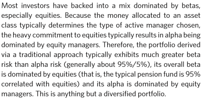 대부분의 투자자들은 베타, 특히 주식에 의해 지배되는 혼합에 뒷걸음질쳤다. 자산 분류에 배분된 돈이 일반적으로 선택된 액티브 매니져 유형을 결정하기 때문에, 주식에 대한 heavy commitment(과도한 비중)은 일반적으로 주식매니저에 의해 지배되는 결과를 낳는다. 따라서 전통적인 접근법을 통해 도출된 포트폴리오에서는 일반적으로 베타리스크가 알파 리스크보다 크며(일반적으로 약 95%/5%), 전체 베타 위험은 주식에 의해 지배되며(보통 연금펀드는 주식과 95%의 상관관계), 알파 리스크는 주식 관리자에 의해 지배된다. 이것은 결코 다각적인 포트폴리오가 아니다.