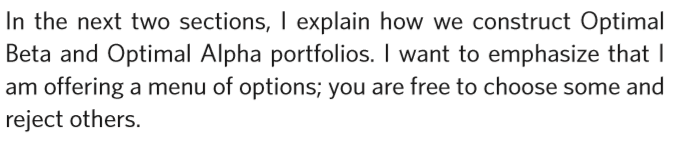 다음 두 섹션에서, 나는 우리가 어떻게 최적 베타와 최적 알파 포트폴리오를 구성하는지 설명한다. 나는 내가 옵션 메뉴를 제공한다는 것을 강조하고 싶다; 너는 자유롭게 어떤 것을 선택하고 다른 것을 거절할 수 있다.