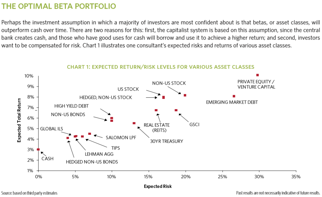 아마도 대다수의 투자자들이 가장 확신하고 있는 투자 가정은 베타, 즉 자산군이 시간이 지남에 따라 현금을 능가(outperform)할 것이라는 것이다. 여기에는 두 가지 이유가 있다 : 첫째, 중앙은행이 현금을 만들고, 현금을 좋은 용도로 사용할 수 있는 사람들이 더 높은 수익을 얻기 위해 돈을 빌려서 사용할 것이이라는 가정에 자본주의 체제가 근거한다는 것이다. 그리고 둘째, 투자자들은 위험에 대한 보상을 원한다. 한 컨설턴트의 차트 1은 다양한 자산군의 예상 위험과 수익을 보여준다.