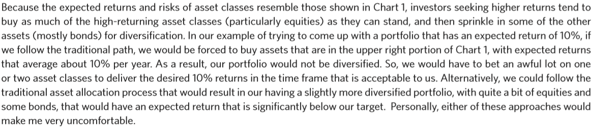 자산계급의 기대수익률과 위험성이 차트 1과 유사하기 때문에, 높은 수익을 추구하는 투자자들은 수익률이 높은 자산계급(특히 주식)을 가능한 많이 사들인 다음, 그 밖의 자산(대부분 채권) 중 일부를 분산시켜 다각화를 도모하는 경향이 있다. 기대수익률이 10%인 포트폴리오를 마련하려고 하는 우리의 사례에서, 만약 우리가 전통적인 방법을 따른다면, 우리는 차트 1의 오른쪽 상단에 있는 자산을 구입해야 할 것이고, 예상 수익률은 연간 평균 10% 정도일 것이다. 결과적으로, 우리의 포트폴리오는 다각화되지 않을 것이다. 따라서, 우리는 우리가 받아들일 수 있는 기간 내에 원하는 10%의 수익을 얻기 위해 한두 개의 자산 등급에 엄청난 돈을 걸어야 할 것이다. 그 대신에, 우리는 기존의 자산 배분 과정을 따를 수 있는데, 이것은 우리의 목표치보다 상당히 낮은 기대 수익을 가지는, 약간 더 다각화된 포트폴리오를 갖는 결과를 가져올 수 있다. 개인적으로, 이 두 가지 접근법은 나를 매우 불편하게 만든다.