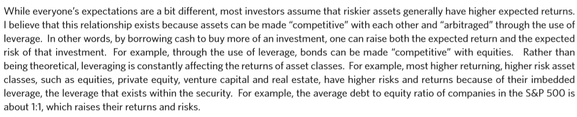 모든 사람들의 기대는 약간 다르지만, 대부분의 투자자들은 위험성이 높은 자산이 일반적으로 더 높은 기대 수익을 가지고 있다고 가정한다. 나는 자산이 레버리지 사용을 통해 서로 "경쟁력있게" 될 수 있고 "차익거래" 될 수 있기 때문에 이러한 관계가 존재한다고 믿는다. 즉, 현금을 빌려 더 많은 투자를 구매함으로써 기대 수익률과 그 투자의 예상 위험을 모두 높일 수 있다. 예를 들어, 레버리지의 사용을 통해 채권은 주식으로 "경쟁력있게"이 될 수 있다. 이론적이기보다는, 활용은 자산 등급의 수익에 지속적으로 영향을 미치고 있다. 예를 들어, 수익률이 가장 높고 리스크가 높은, 주식, 사모, 벤처 캐피털, 부동산과 같은 위험 자산군은 담보 내에 존재하는 레버리지인 내재 레버리지 때문에 위험과 수익이 더 높다. 예를 들어 S&P 500에서 기업의 평균 부채비율은 약 1:1로 수익률과 리스크를 높인다.