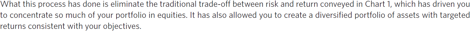 이 프로세스가 수행한 것은 1차트에 전달된 위험과 수익 사이의 전통적인 Trade-off를 제거한 것이다. 이 전통적 Trade off는 여러분을 자기 포트폴리오의 많은 부분을 주식에 집중시키도록 몰아붙였다. 또한 이런 프로세스는 목표와 일치하는 수익을 가지는 분산된 자산군 포트폴리오를 만들 수 있게 되었다.
