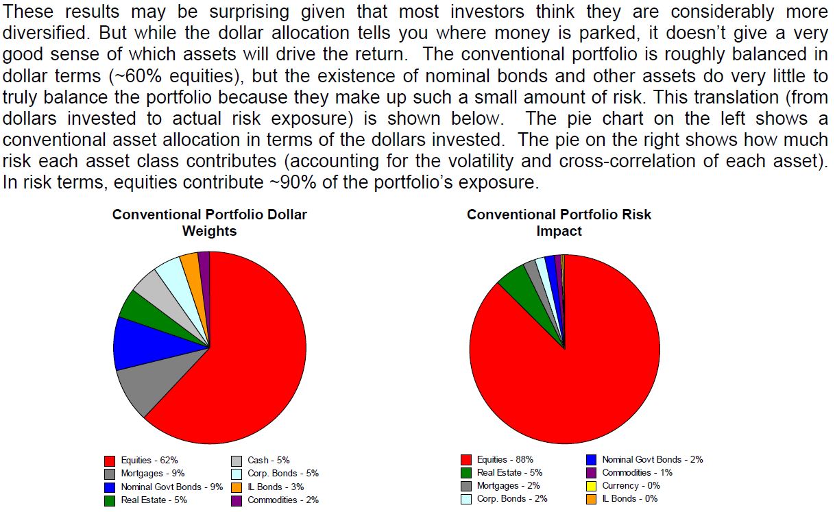 이러한 결과는 대부분의 투자자들이 그들이 상당히 더 많다고 생각하는 것으로 볼 때 놀라울 것이다. 하지만 달러 배분이 돈이 어디에 투자되어 있는지 말해 주지만, 그것은 어떤 자산이 수익률을 높일 것인지에 대한 좋은 감각을 주는 데에는 별로 도움이 되지 않는다. 전통적인 포트폴리오는 투자금액의 약 60%가 주식에 투자되어있어 대략적으로 균형을 이루고 있다. 그러나 명목 채권 및 기타 자산의 존재는 적은 양의 리스크만 만들기 때문에 포트폴리오의 진정한 균형에 거의 도움이 되지 않는다.